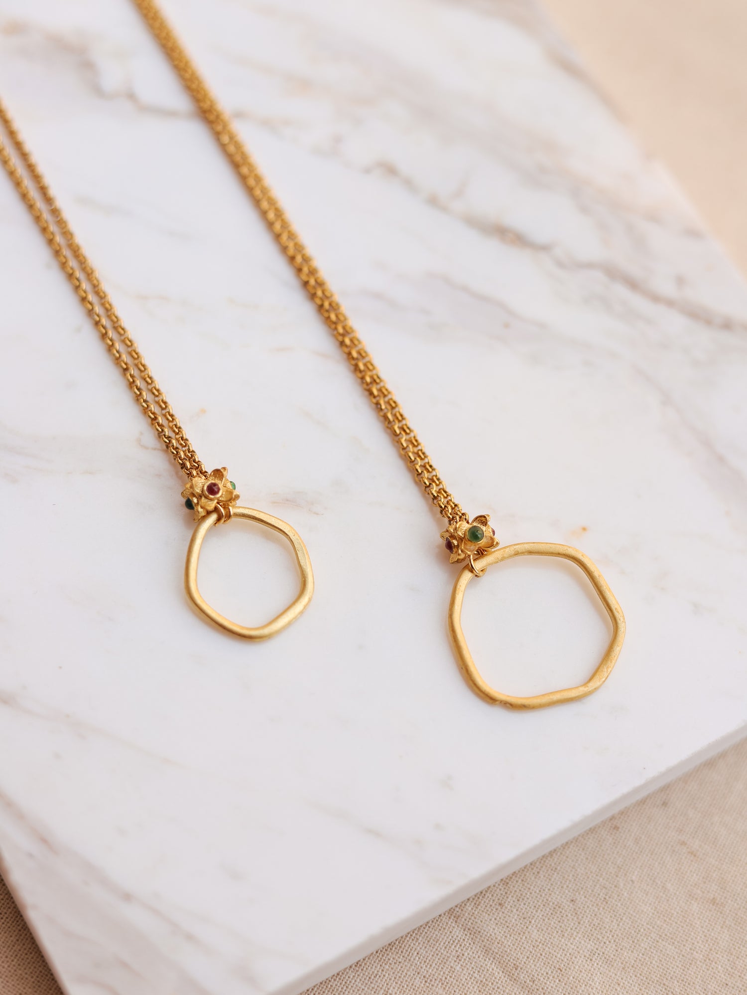 Um conjunto delicado com dois colares elegantes com argolas leves douradas e um detalhe em miosótis.