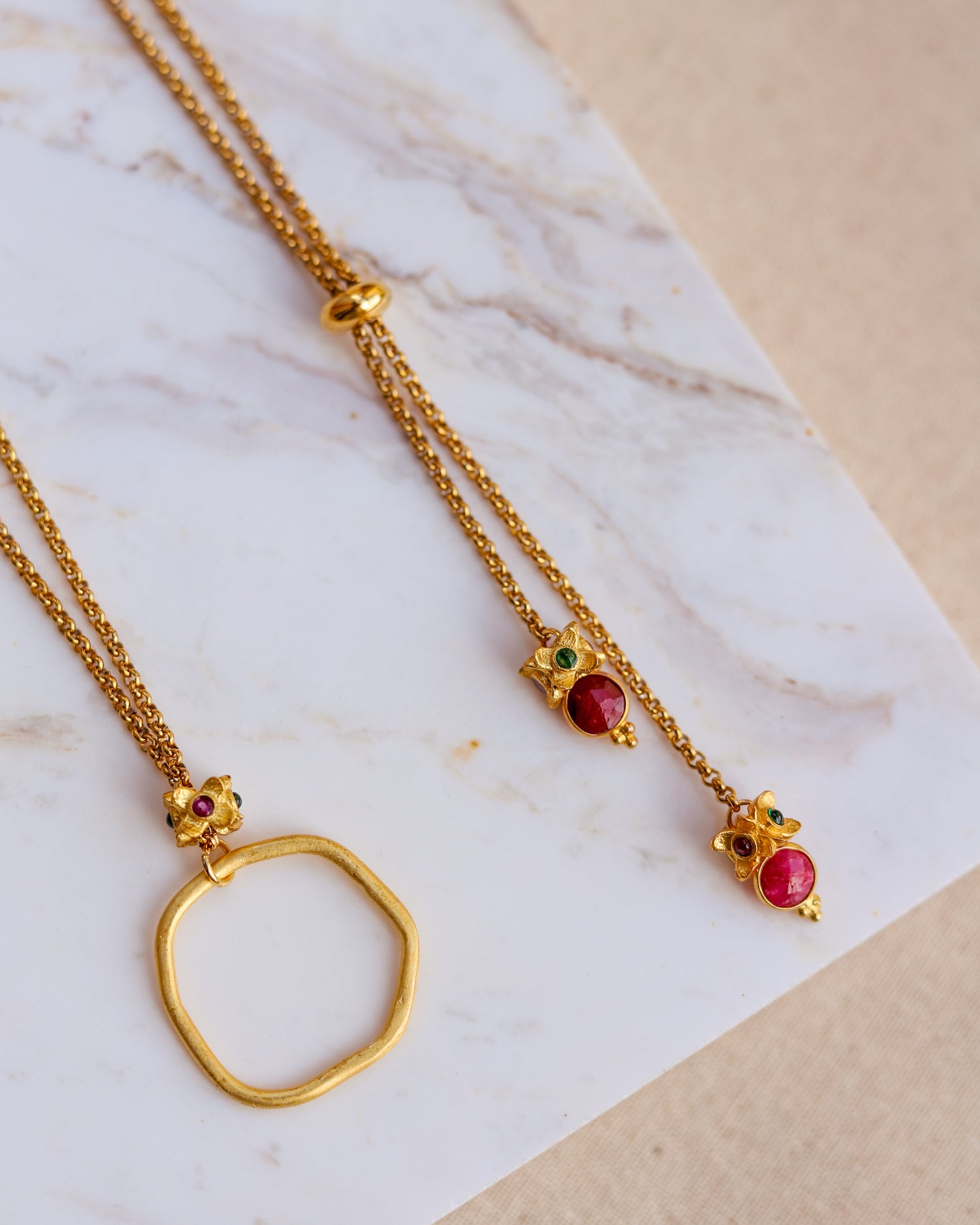 Um conjunto de colares em aço inoxidável, combinando o dourado luminoso com apontamentos em bordeaux. Delicado, versátil e pensado para uso diário sem perder o brilho. Perfeito para dar um toque feminino e marcante a qualquer look.